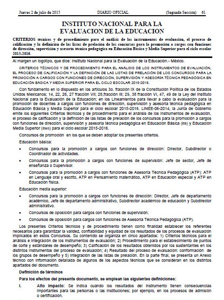 Compartimos los criterios técnicos y de procedimiento para el análisis de los instrumentos de evaluación, el proceso de calificación y la definición de las listas de prelación de los concursos para la promoción a cargos con funciones de dirección, supervisión y asesoría técnica pedagógica en educación básica y media superior para el ciclo escolar 2015-2016. Esperamos que puedan leer y analizar este documento que el INEE acaba de publicar pues es muy importante estar actualizados con las normas y criterios de evaluación del servicio profesional docente.