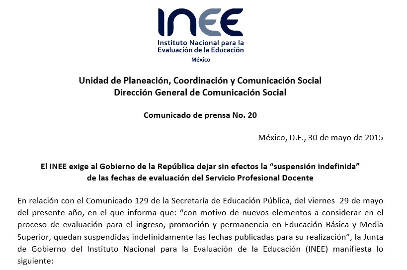 En relación con el Comunicado 129 de la Secretaría de Educación Pública, del viernes 29 de mayo del presente año, en el que informa que: “con motivo de nuevos elementos a considerar en el proceso de evaluación para el ingreso, promoción y permanencia en Educación Básica y Media Superior, quedan suspendidas indefinidamente las fechas publicadas para su realización”, la Junta de Gobierno del Instituto Nacional para la Evaluación de la Educación (INEE). Les compartimos el comunicado completo en formato pdf para que lo puedan leer.
