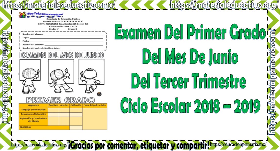 Compañeros y amigos docentes que nos visitan queremos agradecer al compañero José Luis Acosta Sandoval por enviarnos este examen del primer grado del mes de junio del tercer trimestre ciclo escolar 2018 – 2019, que corresponden a dicho mes, pueden utilizar este examen o en su defecto realizar las adecuaciones necesarias para su implementación con su grupo, claro tomando en cuenta los contenidos abordados durante el mes, estamos seguros que les será de gran utilidad para su labor educativa, les pedimos su apoyo y ayuda compartiendo nuestros enlaces en sus redes sociales y etiquetando a sus compañeros y amigos docentes en nuestras publicaciones.