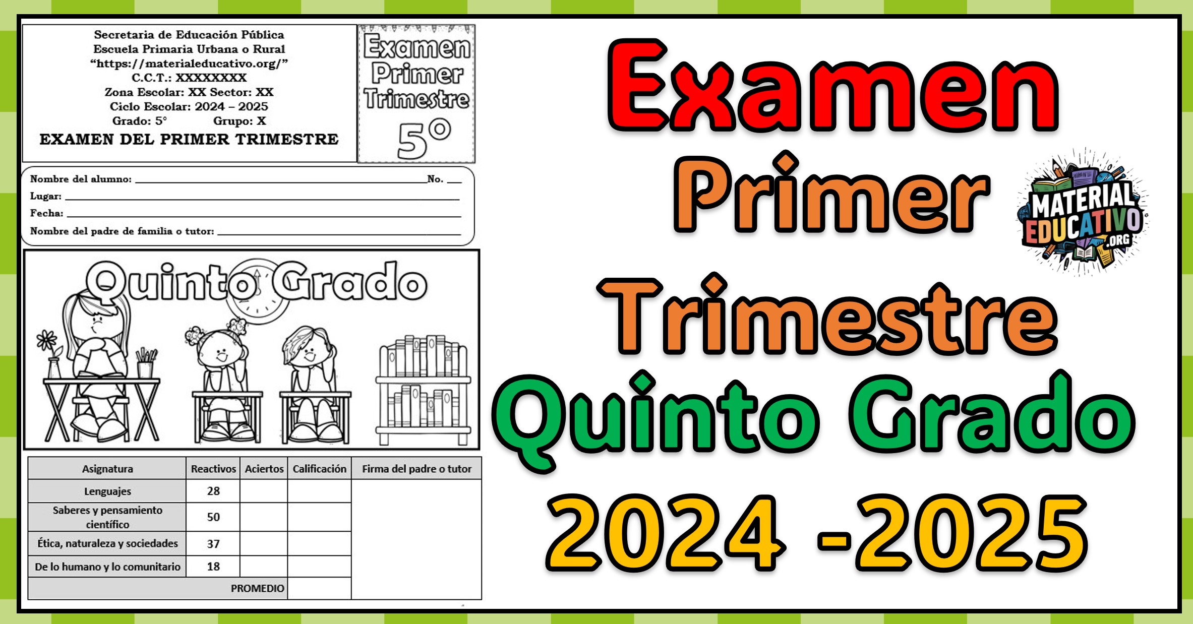 En esta sección encontrarás el examen correspondiente al primer trimestre para alumnos de quinto grado de primaria. Este recurso está diseñado conforme a los contenidos y aprendizajes esperados establecidos en el Plan de Estudios 2022 de la Nueva Escuela Mexicana, asegurando que evalúe habilidades fundamentales en lectura, escritura, matemáticas y desarrollo socioemocional. El examen busca medir el progreso y fomentar el análisis del aprendizaje individual, así como brindar una visión integral del desempeño académico en este primer periodo del ciclo escolar 2024-2025.