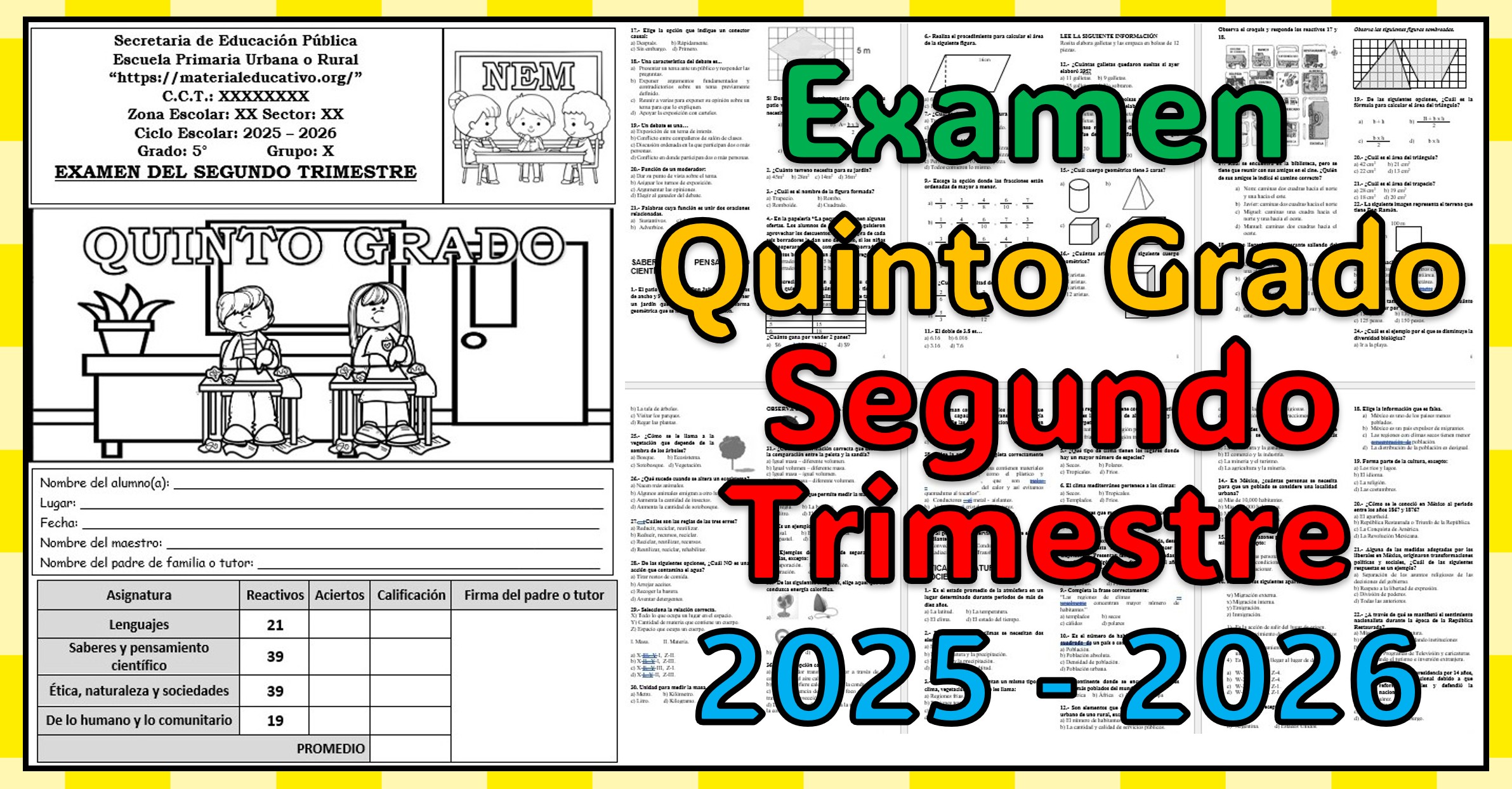 ¡Maestras y maestros de quinto grado!, este recurso es para ustedes! Hoy compartimos el Examen del tercer grado de primaria del segundo trimestre ciclo escolar 2025 – 2026 diseñado para facilitar su trabajo en el aula y fortalecer la evaluación de los aprendizajes de sus estudiantes.