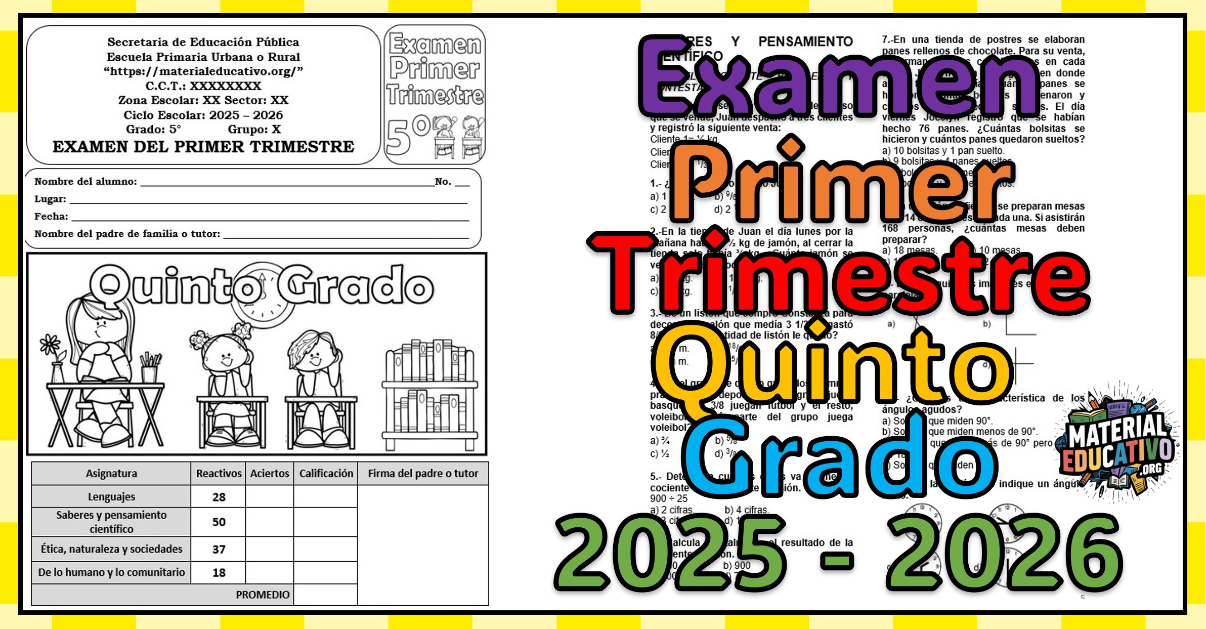 Compañeros en esta oportunidad compartimos el Examen del quinto grado del primer trimestre del ciclo escolar 2025 – 2026. Este examen se encuentra elaborado en formato WORD, listo para su edición y para poder adaptarse a las necesidades y características de sus alumnos.