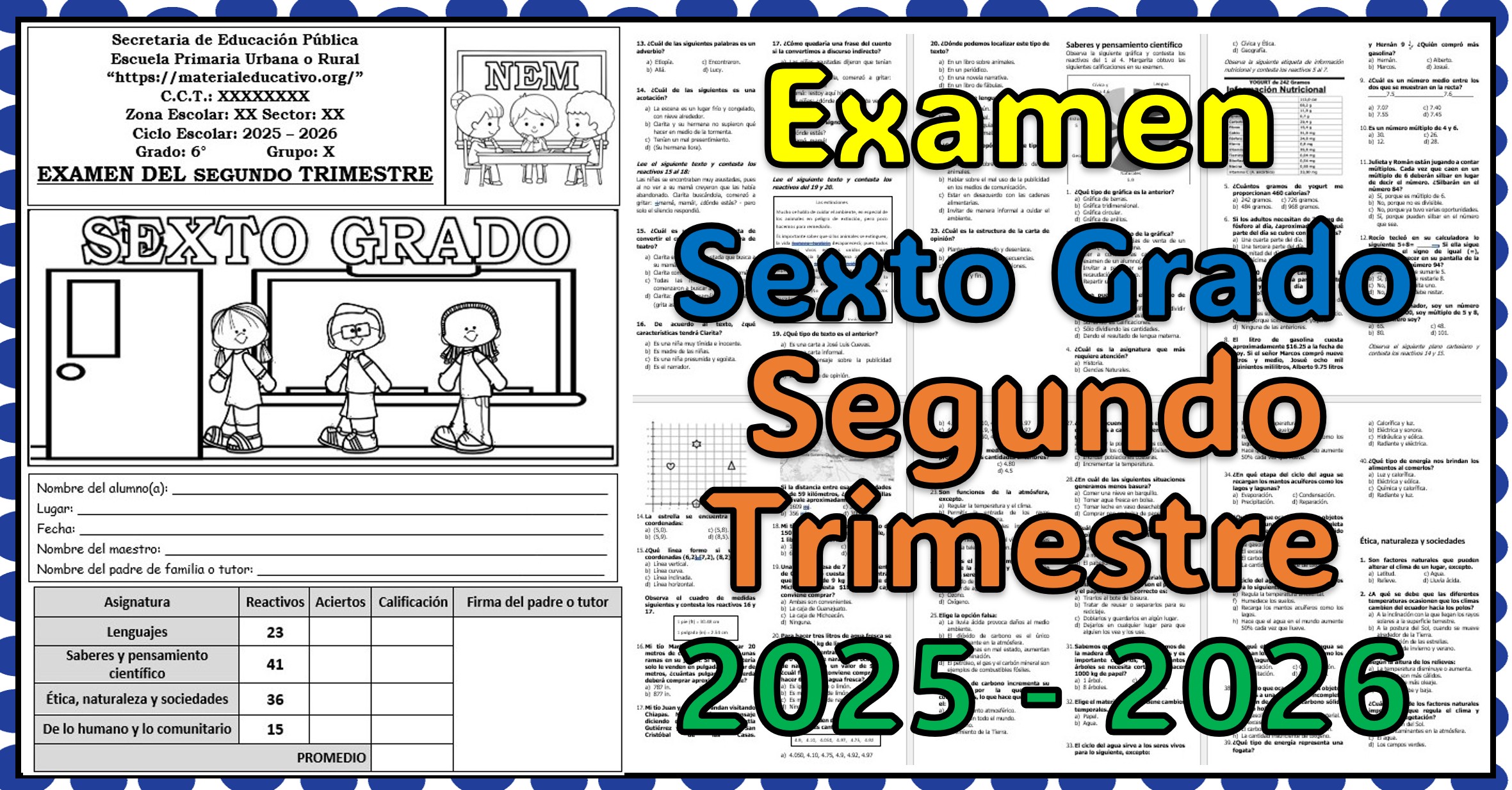 ¡Maestras y maestros de sexto grado!, este recurso es para ustedes! Hoy compartimos el Examen del sexto grado de primaria del segundo trimestre ciclo escolar 2025 – 2026 diseñado para facilitar su trabajo en el aula y fortalecer la evaluación de los aprendizajes de sus estudiantes.