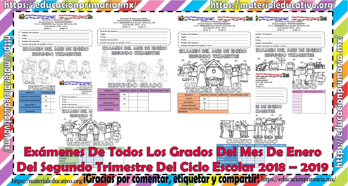 Compañeros y amigos docentes que nos visitan en esta ocasión queremos compartir con todos ustedes los exámenes de todos los grados del mes de enero del segundo trimestre del ciclo escolar 2018 – 2019, con el cual podemos evaluar a nuestros alumnos y conocer el nivel alcanzado durante el mes de enero, recordando que la evaluación es por trimestre de acuerdo al nuevo modelo educativo durante el presente ciclo escolar 2018 – 2019, esperando que sea de su agrado y de gran utilidad compañeros y amigos docentes, les pedimos que nos apoyen compartiendo nuestros enlaces en sus redes sociales y por etiquetar a sus compañeros y amigos docentes en nuestras publicaciones.