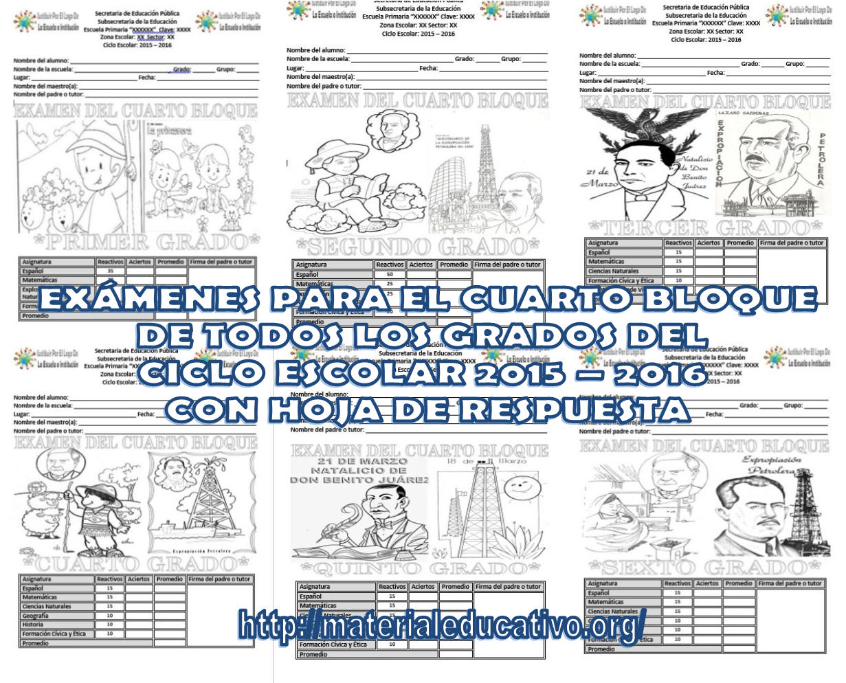 Seguimos compartiendo material de calidad y útil para este bloque y en esta ocasión les compartimos los exámenes para el cuarto bloque de todos los grados del ciclo escolar 2015 – 2016 con hoja de respuesta para poder evaluar a nuestros alumnos de nuestro grupo, agradecemos al autor de este excelente examen pues solo es necesario cambiar algunos datos e imprimir para que nuestros alumnos puedan resolverlo, esperamos que les sea de gran utilidad y lo compartan con sus compañeros y amigos docentes, muchas gracias por su apoyo.