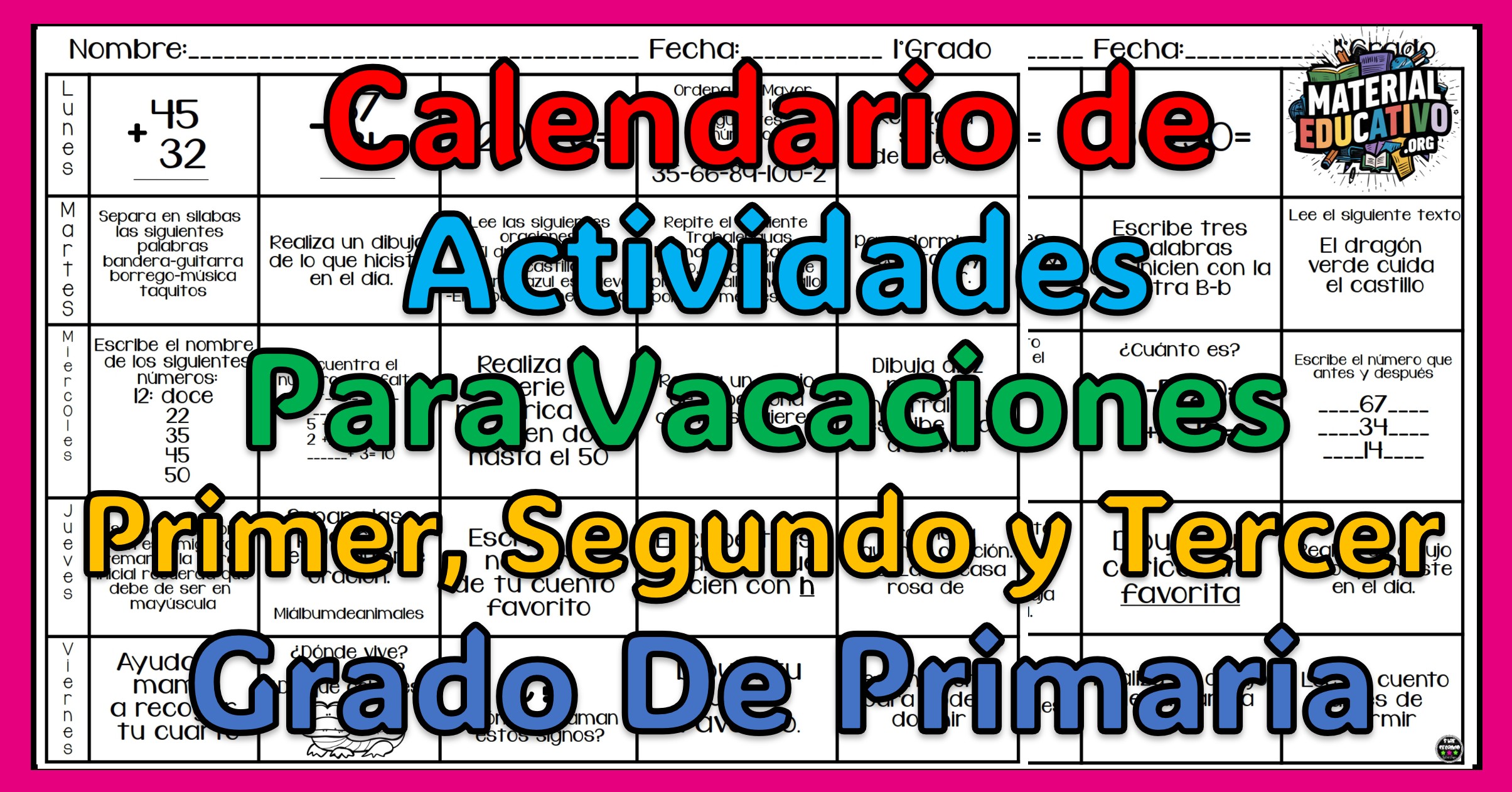 Excelente calendario de actividades para vacaciones de primer, segundo y tercer grado de primaria