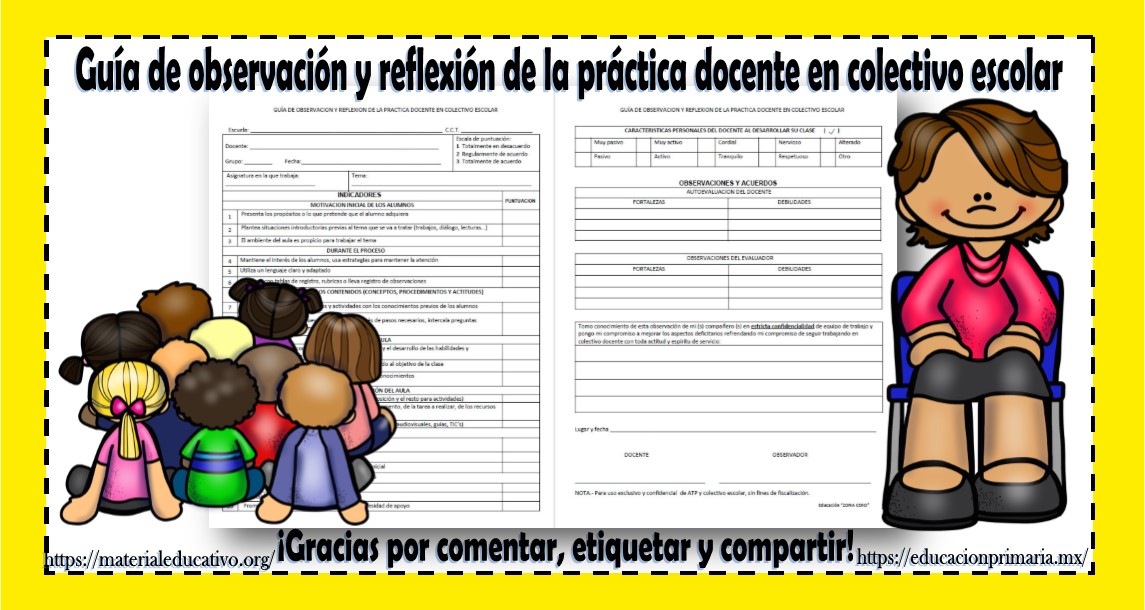 Agradecemos a Educación Zona Cero por diseñar y compartir con todos nosotros esta guía de observación y reflexión de la práctica docente en colectivo escolar, esta excelente guía servirá para que en una clase modelo nos observen y evalúen, al mismo tiempo podemos reflexionar de nuestra práctica docente en conjunto con nuestros compañeros y amigos docentes, esperamos que este material sea de utilidad, muchas gracias por etiquetar a sus compañeros y amigos docentes en nuestras publicaciones y por compartir nuestros enlaces en sus redes sociales.