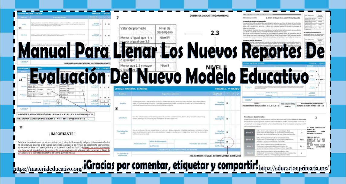 Compañeros y amigos docentes que nos visitan en esta ocasión queremos agradecer al autor de este excelente manual para llenar los nuevos reportes de evaluación del nuevo modelo educativo que desconocemos pero estamos agradecidos por compartir este excelente material con todos nosotros, esperamos que sea de gran utilidad para su labor educativa y para el llenado de los reportes de evaluación de su grupo, muchas gracias por compartir nuestros enlaces en sus redes sociales.