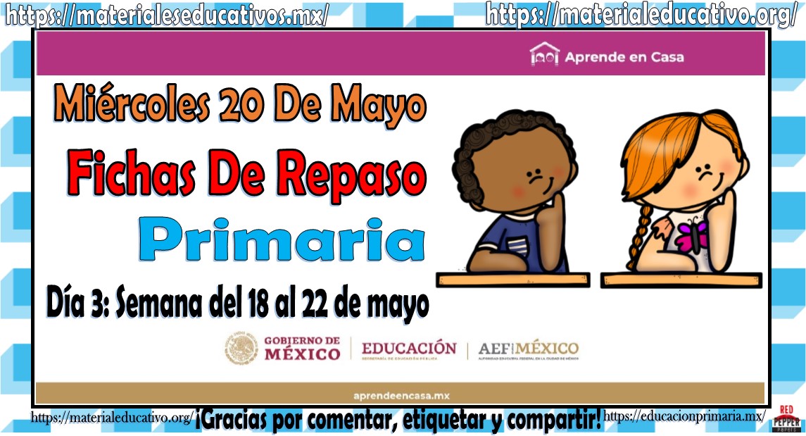 Compañeros docentes, padres de familia y alumnos que nos visitan el día de hoy queremos compartir con todos ustedes las Fichas de repaso para todos los grados de primaria aprende en casa del miércoles 20 día 3 semana del 18 al 22 de mayo, este excelente material está organizado por días y se relacionan con las clases por TV aprende en casa.