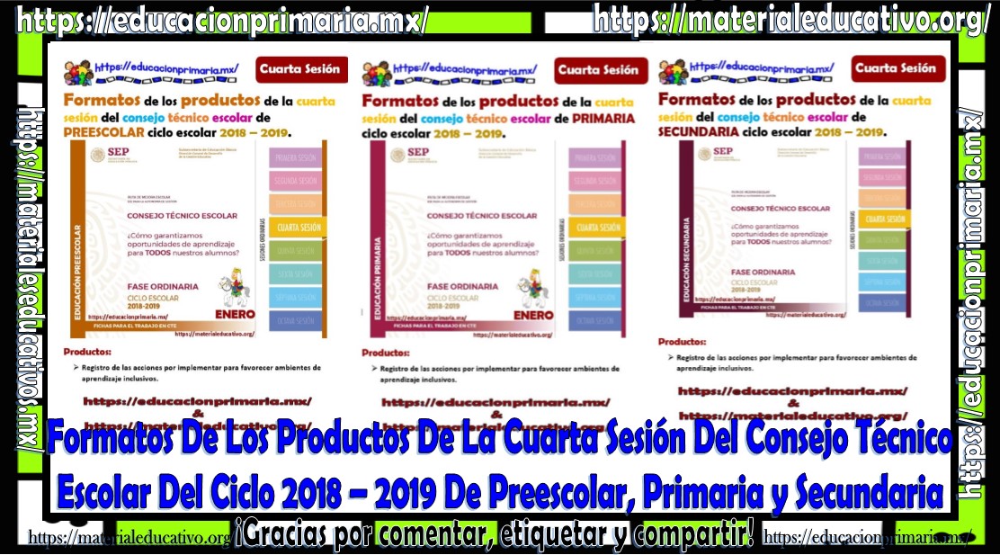 Compañeros y amigos docentes que nos visitan como saben se aproxima la cuarta sesión del consejo técnico escolar del mes de enero y para poder agilizar y facilitar su labor educativa queremos compartir con todos ustedes los Formatos de los productos de la cuarta sesión del consejo técnico escolar del ciclo 2018 – 2019 de preescolar, primaria y secundaria que nos servirán para poder realizar nuestros productos y con ello poder terminar en tiempo y forma esta 4ta sesión del CTE, muy pronto les compartiremos la presentación y un ejemplo de los productos, así como todos los materiales que vamos a utilizar durante dicha sesión, muchas gracias por compartir nuestros enlaces en sus redes sociales y etiquetar a sus compañeros y amigos docentes en nuestras publicaciones.