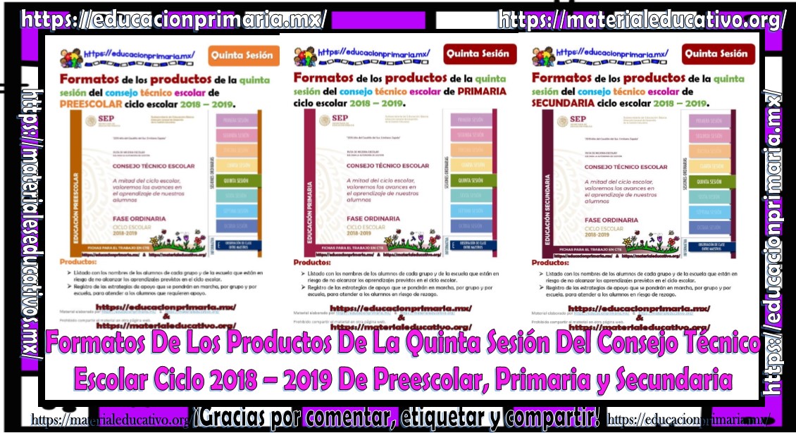 Compañeros y amigos docentes que nos visitan, seguimos trabajando y diseñando, en esta ocasión les proporcionamos los Formatos de los productos de la quinta sesión del consejo técnico escolar ciclo 2018 – 2019 de preescolar, primaria y secundaria elaborados por nosotros, el archivo se encuentra en WORD para facilitar su edición, de la misma manera sabemos que con este material podrán agilizar la sesión del consejo técnico escolar, muy pronto les vamos a compartir ejemplos de los productos, presentaciones en Power Point y material que se utilizara en esta 5ta sesión del CTE, solo les pedimos que nos sigan apoyando compartiendo nuestro material en sus redes sociales y etiquetando a sus compañeros y amigos docentes que nos visitan, muchas gracias por visitar https://materialeducativo.org/