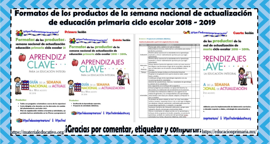 En Material Educativo agradecemos que nos sigan apoyando y visitando nuestra web, se aproxima la semana nacional de actualización que se llevara a cabo del 06 de agosto al 10 de agosto del presente año, en esta ocasión diseñamos para todos ustedes los formatos de los productos para la semana nacional de actualización de educación primaria ciclo escolar 2018 – 2019 para facilitar la realización de los productos y de esta manera facilitar la realización de la semana nacional de actualización, muchas gracias por compartir nuestros enlaces en sus redes sociales y por etiquetar a sus compañeros y amigos docentes en nuestras publicaciones, recuerden visitar y recomendar materialeducativo.org/