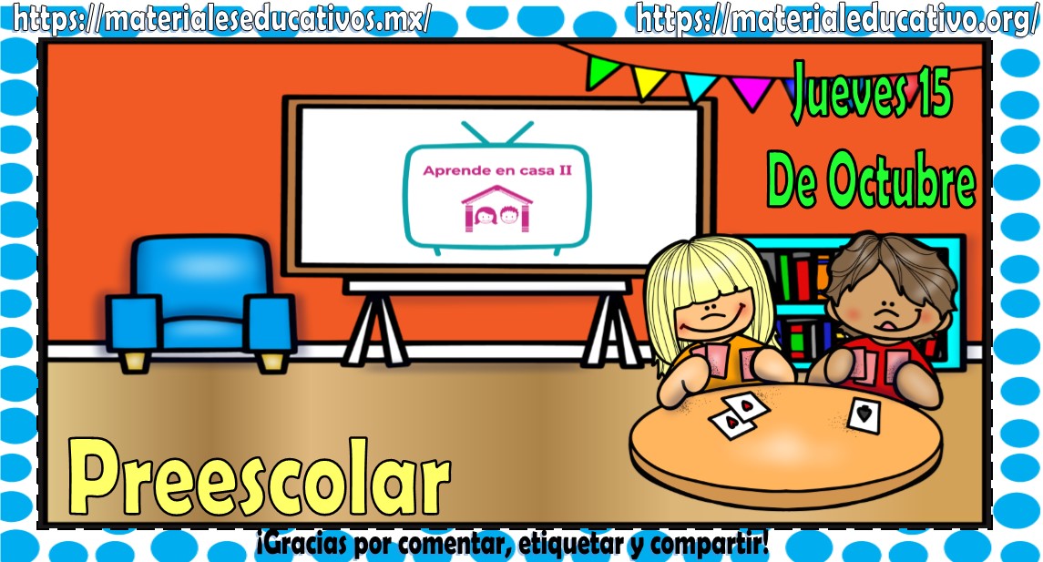 Amigos, compañeros docentes, padres de familia y alumnos que nos visitan, como ya es costumbre nosotros les proporcionaremos las clases contempladas para observarse en la TV del programa aprende en casa II, lo que antes se conocía como videos y preguntas. En esta oportunidad les queremos proporcionar las Mis clases de aprende en casa II de preescolar del jueves 15 de octubre del 2020, estaremos seguros que con este material podrá facilitar la realización de las actividades planteadas por parte del programa. Muchas gracias por visitarnos y recuerden que aquí podrán encontrar las preguntas, videos y todas las clases del programa de aprende en casa 2. Recuerden compartir nuestros enlaces en sus redes sociales y etiquetar a sus compañeros y amigos docentes en nuestras publicaciones.