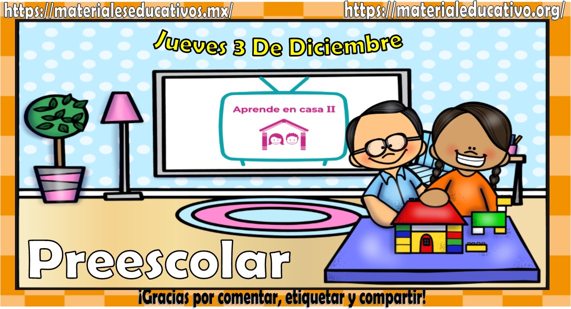 Amigos, compañeros docentes, padres de familia y alumnos que nos visitan, como ya es costumbre nosotros les proporcionaremos las clases contempladas para observarse en la TV del programa aprende en casa II, lo que antes se conocía como videos y preguntas. En esta oportunidad les queremos proporcionar las Mis clases de aprende en casa II de preescolar del jueves 3 de diciembre del 2020, estaremos seguros que con este material podrá facilitar la realización de las actividades planteadas por parte del programa. Muchas gracias por visitarnos y recuerden que aquí podrán encontrar las preguntas, videos y todas las clases del programa de aprende en casa 2. Recuerden compartir nuestros enlaces en sus redes sociales y etiquetar a sus compañeros y amigos docentes en nuestras publicaciones.