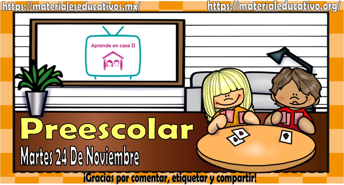 Amigos, compañeros docentes, padres de familia y alumnos que nos visitan, como ya es costumbre nosotros les proporcionaremos las clases contempladas para observarse en la TV del programa aprende en casa II, lo que antes se conocía como videos y preguntas. En esta oportunidad les queremos proporcionar las Mis clases de aprende en casa II de preescolar del martes 24 de noviembre del 2020, estaremos seguros que con este material podrá facilitar la realización de las actividades planteadas por parte del programa. Muchas gracias por visitarnos y recuerden que aquí podrán encontrar las preguntas, videos y todas las clases del programa de aprende en casa 2. Recuerden compartir nuestros enlaces en sus redes sociales y etiquetar a sus compañeros y amigos docentes en nuestras publicaciones.