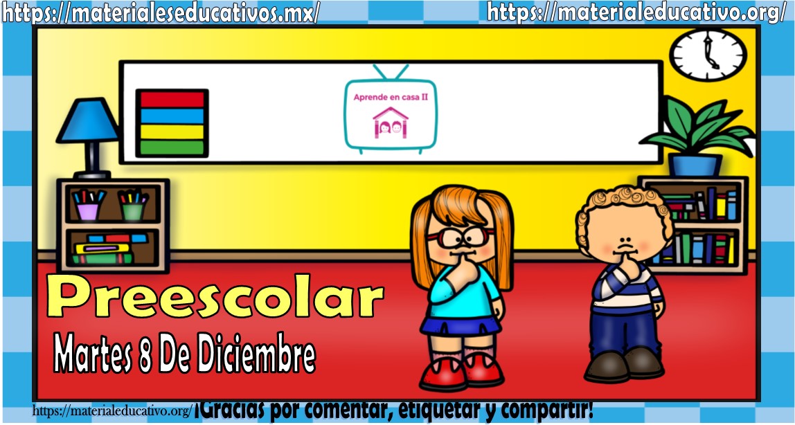 Amigos, compañeros docentes, padres de familia y alumnos que nos visitan, como ya es costumbre nosotros les proporcionaremos las clases contempladas para observarse en la TV del programa aprende en casa II, lo que antes se conocía como videos y preguntas. En esta oportunidad les queremos proporcionar las Mis clases de aprende en casa II de preescolar del martes 8 de diciembre del 2020, estaremos seguros que con este material podrá facilitar la realización de las actividades planteadas por parte del programa. Muchas gracias por visitarnos y recuerden que aquí podrán encontrar las preguntas, videos y todas las clases del programa de aprende en casa 2. Recuerden compartir nuestros enlaces en sus redes sociales y etiquetar a sus compañeros y amigos docentes en nuestras publicaciones.
