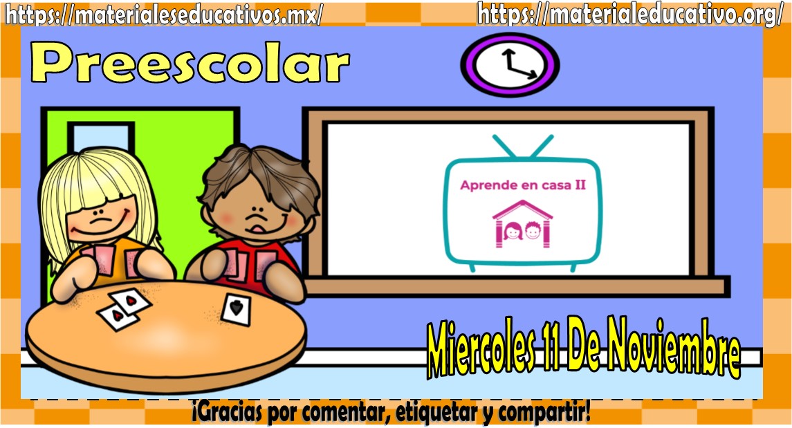 Amigos, compañeros docentes, padres de familia y alumnos que nos visitan, como ya es costumbre nosotros les proporcionaremos las clases contempladas para observarse en la TV del programa aprende en casa II, lo que antes se conocía como videos y preguntas. En esta oportunidad les queremos proporcionar las Mis clases de aprende en casa II de preescolar del miércoles 11 de noviembre del 2020, estaremos seguros que con este material podrá facilitar la realización de las actividades planteadas por parte del programa. Muchas gracias por visitarnos y recuerden que aquí podrán encontrar las preguntas, videos y todas las clases del programa de aprende en casa 2. Recuerden compartir nuestros enlaces en sus redes sociales y etiquetar a sus compañeros y amigos docentes en nuestras publicaciones.