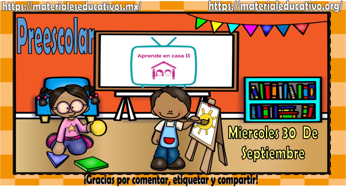 Amigos, compañeros docentes, padres de familia y alumnos que nos visitan, como ya es costumbre nosotros les proporcionaremos las clases contempladas para observarse en la TV del programa aprende en casa II, lo que antes se conocía como videos y preguntas. En esta oportunidad les queremos proporcionar las Mis clases de aprende en casa II de preescolar del miércoles 30 de septiembre del 2020, estaremos seguros que con este material podrá facilitar la realización de las actividades planteadas por parte del programa. Muchas gracias por visitarnos y recuerden que aquí podrán encontrar las preguntas, videos y todas las clases del programa de aprende en casa 2. Recuerden compartir nuestros enlaces en sus redes sociales y etiquetar a sus compañeros y amigos docentes en nuestras publicaciones.