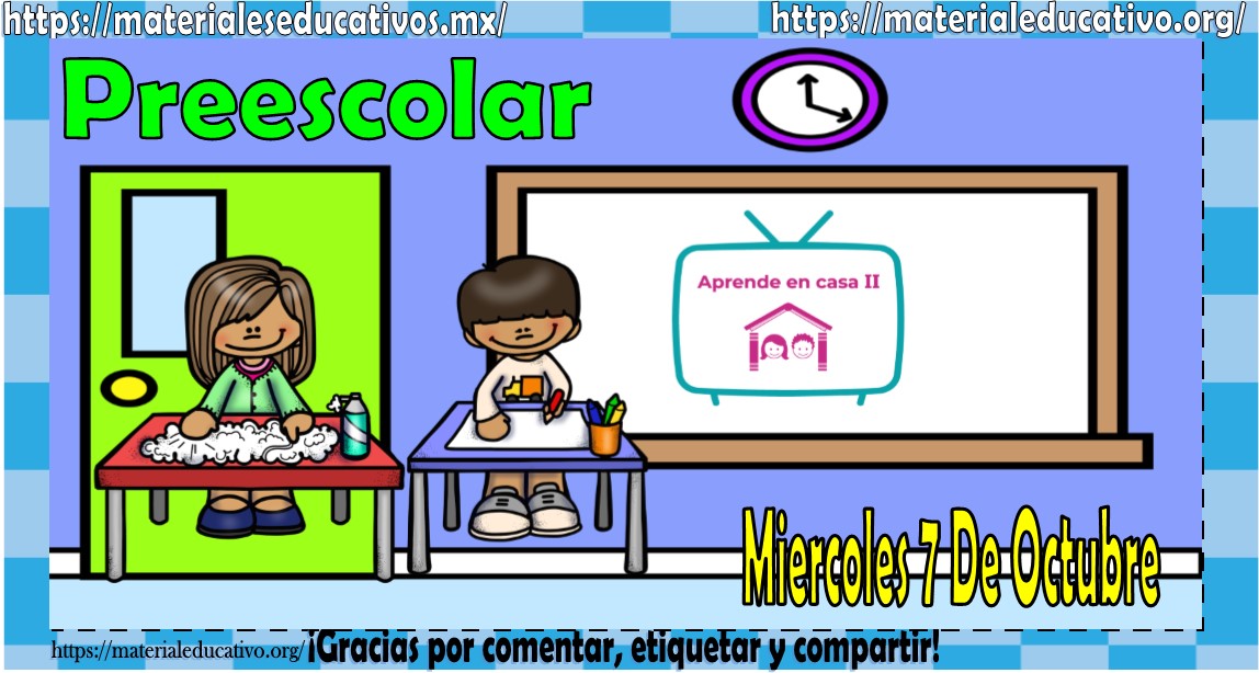 Amigos, compañeros docentes, padres de familia y alumnos que nos visitan, como ya es costumbre nosotros les proporcionaremos las clases contempladas para observarse en la TV del programa aprende en casa II, lo que antes se conocía como videos y preguntas. En esta oportunidad les queremos proporcionar las Mis clases de aprende en casa II de preescolar del miércoles 7 de octubre del 2020, estaremos seguros que con este material podrá facilitar la realización de las actividades planteadas por parte del programa. Muchas gracias por visitarnos y recuerden que aquí podrán encontrar las preguntas, videos y todas las clases del programa de aprende en casa 2. Recuerden compartir nuestros enlaces en sus redes sociales y etiquetar a sus compañeros y amigos docentes en nuestras publicaciones.
