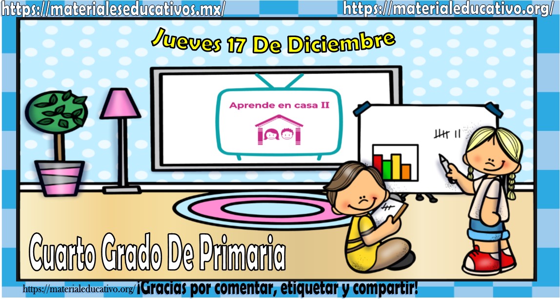 Amigos, compañeros docentes, padres de familia y alumnos que nos visitan, como ya es costumbre nosotros les proporcionaremos las clases contempladas para observarse en la TV del programa aprende en casa II, lo que antes se conocía como videos y preguntas. En esta oportunidad les queremos proporcionar las clases del cuarto grado de primaria del jueves 17 de diciembre del 2020 del presente ciclo escolar 2020 – 2021, estaremos seguros que con este material podrá facilitar la realización de las actividades planteadas por parte del programa. Muchas gracias por visitarnos y recuerden que aquí podrán encontrar las preguntas, videos y todas las clases del programa de aprende en casa 2. Recuerden compartir nuestros enlaces en sus redes sociales y etiquetar a sus compañeros y amigos docentes en nuestras publicaciones.