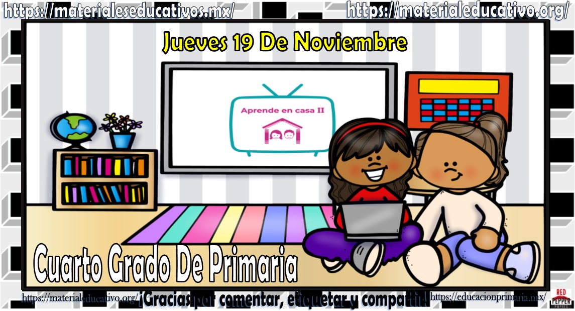 Amigos, compañeros docentes, padres de familia y alumnos que nos visitan, como ya es costumbre nosotros les proporcionaremos las clases contempladas para observarse en la TV del programa aprende en casa II, lo que antes se conocía como videos y preguntas. En esta oportunidad les queremos proporcionar las clases del cuarto grado de primaria del jueves 19 de noviembre del 2020 del presente ciclo escolar 2020 – 2021, estaremos seguros que con este material podrá facilitar la realización de las actividades planteadas por parte del programa. Muchas gracias por visitarnos y recuerden que aquí podrán encontrar las preguntas, videos y todas las clases del programa de aprende en casa 2. Recuerden compartir nuestros enlaces en sus redes sociales y etiquetar a sus compañeros y amigos docentes en nuestras publicaciones.