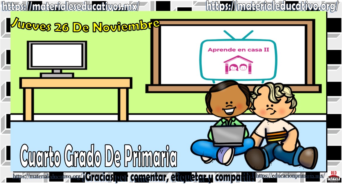 Amigos, compañeros docentes, padres de familia y alumnos que nos visitan, como ya es costumbre nosotros les proporcionaremos las clases contempladas para observarse en la TV del programa aprende en casa II, lo que antes se conocía como videos y preguntas. En esta oportunidad les queremos proporcionar las clases del cuarto grado de primaria del jueves 26 de noviembre del 2020 del presente ciclo escolar 2020 – 2021, estaremos seguros que con este material podrá facilitar la realización de las actividades planteadas por parte del programa. Muchas gracias por visitarnos y recuerden que aquí podrán encontrar las preguntas, videos y todas las clases del programa de aprende en casa 2. Recuerden compartir nuestros enlaces en sus redes sociales y etiquetar a sus compañeros y amigos docentes en nuestras publicaciones.