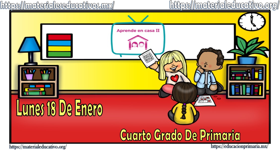 Amigos, compañeros docentes, padres de familia y alumnos que nos visitan, como ya es costumbre nosotros les proporcionaremos las clases contempladas para observarse en la TV del programa aprende en casa II, lo que antes se conocía como videos y preguntas. En esta oportunidad les queremos proporcionar las clases del cuarto grado de primaria del lunes 18 de enero del 2021 del presente ciclo escolar 2020 – 2021, estaremos seguros que con este material podrá facilitar la realización de las actividades planteadas por parte del programa. Muchas gracias por visitarnos y recuerden que aquí podrán encontrar las preguntas, videos y todas las clases del programa de aprende en casa 2. Recuerden compartir nuestros enlaces en sus redes sociales y etiquetar a sus compañeros y amigos docentes en nuestras publicaciones.