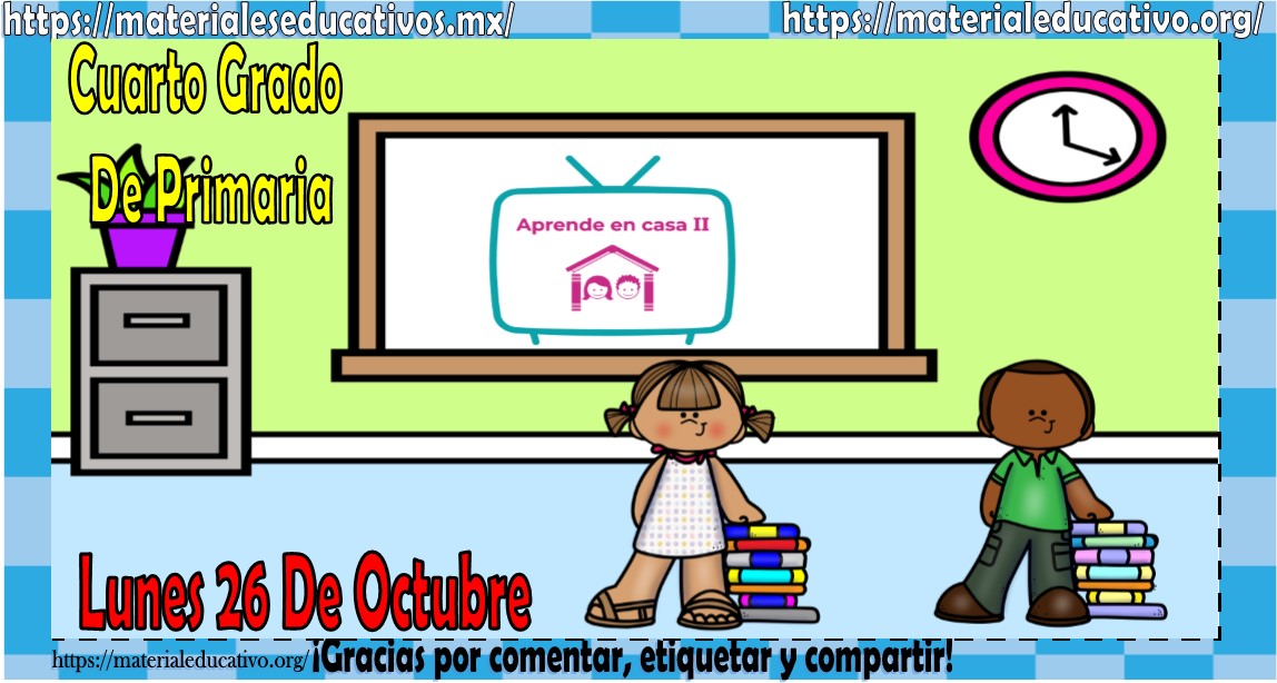 Amigos, compañeros docentes, padres de familia y alumnos que nos visitan, como ya es costumbre nosotros les proporcionaremos las clases contempladas para observarse en la TV del programa aprende en casa II, lo que antes se conocía como videos y preguntas. En esta oportunidad les queremos proporcionar las clases del cuarto grado de primaria del lunes 26 de octubre del 2020 del presente ciclo escolar 2020 – 2021, estaremos seguros que con este material podrá facilitar la realización de las actividades planteadas por parte del programa. Muchas gracias por visitarnos y recuerden que aquí podrán encontrar las preguntas, videos y todas las clases del programa de aprende en casa 2. Recuerden compartir nuestros enlaces en sus redes sociales y etiquetar a sus compañeros y amigos docentes en nuestras publicaciones.
