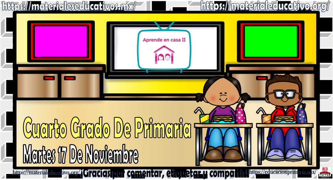 Amigos, compañeros docentes, padres de familia y alumnos que nos visitan, como ya es costumbre nosotros les proporcionaremos las clases contempladas para observarse en la TV del programa aprende en casa II, lo que antes se conocía como videos y preguntas. En esta oportunidad les queremos proporcionar las clases del cuarto grado de primaria del martes 17 de noviembre del 2020 del presente ciclo escolar 2020 – 2021, estaremos seguros que con este material podrá facilitar la realización de las actividades planteadas por parte del programa. Muchas gracias por visitarnos y recuerden que aquí podrán encontrar las preguntas, videos y todas las clases del programa de aprende en casa 2. Recuerden compartir nuestros enlaces en sus redes sociales y etiquetar a sus compañeros y amigos docentes en nuestras publicaciones.