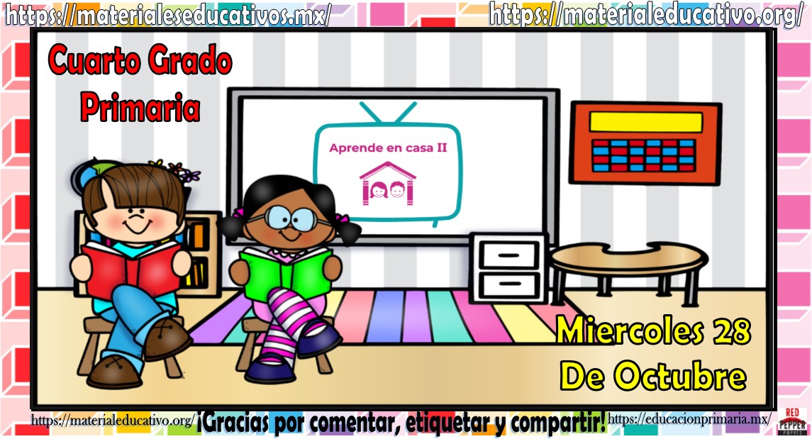 Amigos, compañeros docentes, padres de familia y alumnos que nos visitan, como ya es costumbre nosotros les proporcionaremos las clases contempladas para observarse en la TV del programa aprende en casa II, lo que antes se conocía como videos y preguntas. En esta oportunidad les queremos proporcionar las clases del cuarto grado de primaria del miércoles 28 de octubre del 2020 del presente ciclo escolar 2020 – 2021, estaremos seguros que con este material podrá facilitar la realización de las actividades planteadas por parte del programa. Muchas gracias por visitarnos y recuerden que aquí podrán encontrar las preguntas, videos y todas las clases del programa de aprende en casa 2. Recuerden compartir nuestros enlaces en sus redes sociales y etiquetar a sus compañeros y amigos docentes en nuestras publicaciones.