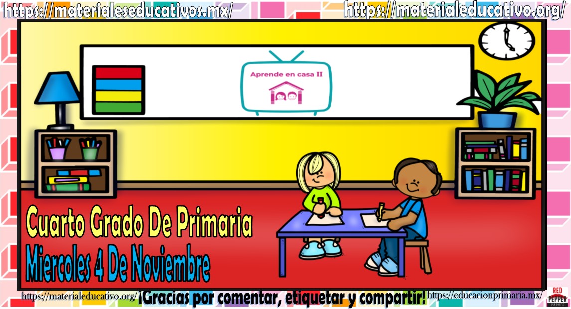 Amigos, compañeros docentes, padres de familia y alumnos que nos visitan, como ya es costumbre nosotros les proporcionaremos las clases contempladas para observarse en la TV del programa aprende en casa II, lo que antes se conocía como videos y preguntas. En esta oportunidad les queremos proporcionar las clases del cuarto grado de primaria del miércoles 4 de noviembre del 2020 del presente ciclo escolar 2020 – 2021, estaremos seguros que con este material podrá facilitar la realización de las actividades planteadas por parte del programa. Muchas gracias por visitarnos y recuerden que aquí podrán encontrar las preguntas, videos y todas las clases del programa de aprende en casa 2. Recuerden compartir nuestros enlaces en sus redes sociales y etiquetar a sus compañeros y amigos docentes en nuestras publicaciones.
