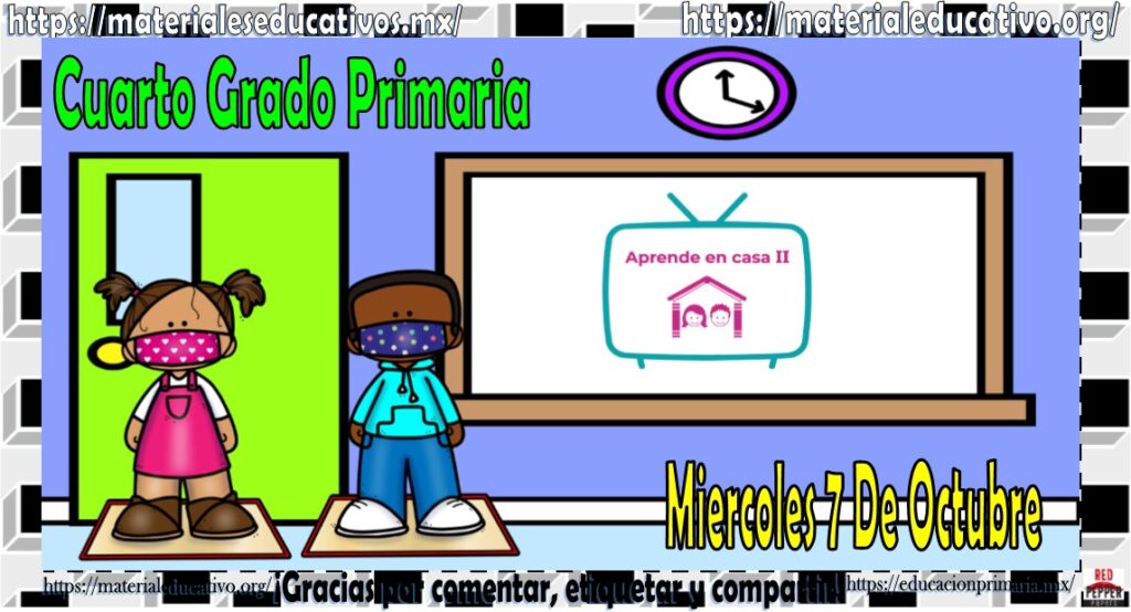 Amigos, compañeros docentes, padres de familia y alumnos que nos visitan, como ya es costumbre nosotros les proporcionaremos las clases contempladas para observarse en la TV del programa aprende en casa II, lo que antes se conocía como videos y preguntas. En esta oportunidad les queremos proporcionar las clases del cuarto grado de primaria del miércoles 7 de octubre del 2020 del presente ciclo escolar 2020 – 2021, estaremos seguros que con este material podrá facilitar la realización de las actividades planteadas por parte del programa. Muchas gracias por visitarnos y recuerden que aquí podrán encontrar las preguntas, videos y todas las clases del programa de aprende en casa 2. Recuerden compartir nuestros enlaces en sus redes sociales y etiquetar a sus compañeros y amigos docentes en nuestras publicaciones.