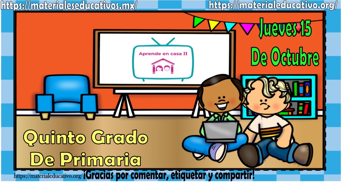 Amigos, compañeros docentes, padres de familia y alumnos que nos visitan, como ya es costumbre nosotros les proporcionaremos las clases contempladas para observarse en la TV del programa aprende en casa II, lo que antes se conocía como videos y preguntas. En esta oportunidad les queremos proporcionar las clases del quinto grado de primaria del jueves 15 de octubre del 2020 del presente ciclo escolar 2020 – 2021, estaremos seguros que con este material podrá facilitar la realización de las actividades planteadas por parte del programa. Muchas gracias por visitarnos y recuerden que aquí podrán encontrar las preguntas, videos y todas las clases del programa de aprende en casa 2. Recuerden compartir nuestros enlaces en sus redes sociales y etiquetar a sus compañeros y amigos docentes en nuestras publicaciones.