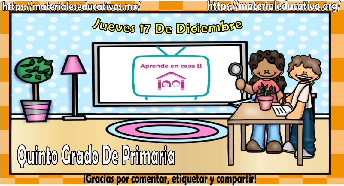 Amigos, compañeros docentes, padres de familia y alumnos que nos visitan, como ya es costumbre nosotros les proporcionaremos las clases contempladas para observarse en la TV del programa aprende en casa II, lo que antes se conocía como videos y preguntas. En esta oportunidad les queremos proporcionar las clases del quinto grado de primaria del jueves 17 de diciembre del 2020 del presente ciclo escolar 2020 – 2021, estaremos seguros que con este material podrá facilitar la realización de las actividades planteadas por parte del programa. Muchas gracias por visitarnos y recuerden que aquí podrán encontrar las preguntas, videos y todas las clases del programa de aprende en casa 2. Recuerden compartir nuestros enlaces en sus redes sociales y etiquetar a sus compañeros y amigos docentes en nuestras publicaciones.