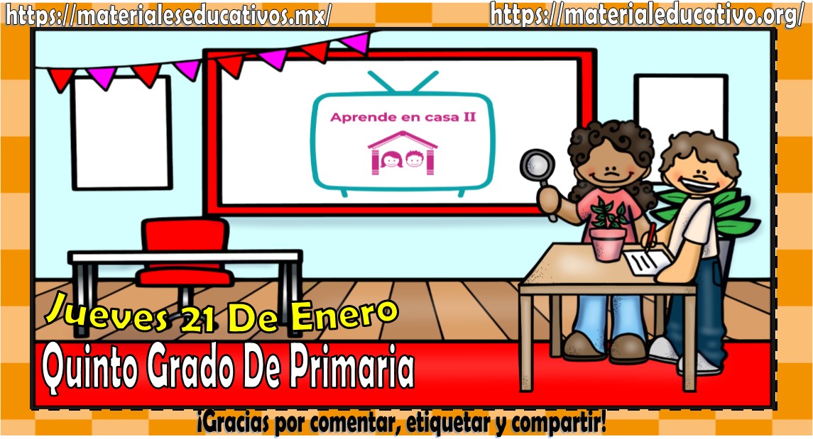 Amigos, compañeros docentes, padres de familia y alumnos que nos visitan, como ya es costumbre nosotros les proporcionaremos las clases contempladas para observarse en la TV del programa aprende en casa II, lo que antes se conocía como videos y preguntas. En esta oportunidad les queremos proporcionar las clases del quinto grado de primaria del jueves 21 de enero del 2021 del presente ciclo escolar 2020 – 2021, estaremos seguros que con este material podrá facilitar la realización de las actividades planteadas por parte del programa. Muchas gracias por visitarnos y recuerden que aquí podrán encontrar las preguntas, videos y todas las clases del programa de aprende en casa 2. Recuerden compartir nuestros enlaces en sus redes sociales y etiquetar a sus compañeros y amigos docentes en nuestras publicaciones.