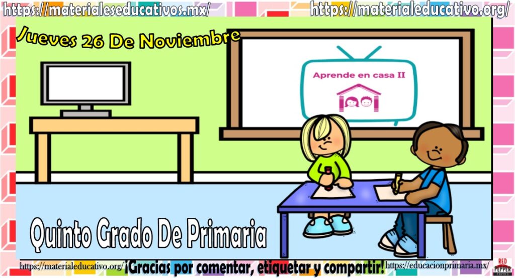 Amigos, compañeros docentes, padres de familia y alumnos que nos visitan, como ya es costumbre nosotros les proporcionaremos las clases contempladas para observarse en la TV del programa aprende en casa II, lo que antes se conocía como videos y preguntas. En esta oportunidad les queremos proporcionar las clases del quinto grado de primaria del jueves 26 de noviembre del 2020 del presente ciclo escolar 2020 – 2021, estaremos seguros que con este material podrá facilitar la realización de las actividades planteadas por parte del programa. Muchas gracias por visitarnos y recuerden que aquí podrán encontrar las preguntas, videos y todas las clases del programa de aprende en casa 2. Recuerden compartir nuestros enlaces en sus redes sociales y etiquetar a sus compañeros y amigos docentes en nuestras publicaciones.