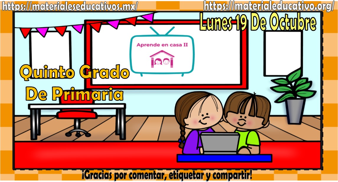 Amigos, compañeros docentes, padres de familia y alumnos que nos visitan, como ya es costumbre nosotros les proporcionaremos las clases contempladas para observarse en la TV del programa aprende en casa II, lo que antes se conocía como videos y preguntas. En esta oportunidad les queremos proporcionar las clases del quinto grado de primaria del lunes 19 de octubre del 2020 del presente ciclo escolar 2020 – 2021, estaremos seguros que con este material podrá facilitar la realización de las actividades planteadas por parte del programa. Muchas gracias por visitarnos y recuerden que aquí podrán encontrar las preguntas, videos y todas las clases del programa de aprende en casa 2. Recuerden compartir nuestros enlaces en sus redes sociales y etiquetar a sus compañeros y amigos docentes en nuestras publicaciones.
