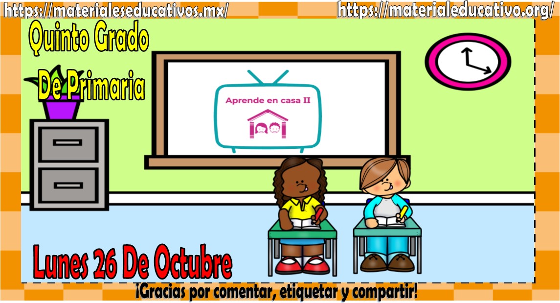 Amigos, compañeros docentes, padres de familia y alumnos que nos visitan, como ya es costumbre nosotros les proporcionaremos las clases contempladas para observarse en la TV del programa aprende en casa II, lo que antes se conocía como videos y preguntas. En esta oportunidad les queremos proporcionar las clases del quinto grado de primaria del lunes 26 de octubre del 2020 del presente ciclo escolar 2020 – 2021, estaremos seguros que con este material podrá facilitar la realización de las actividades planteadas por parte del programa. Muchas gracias por visitarnos y recuerden que aquí podrán encontrar las preguntas, videos y todas las clases del programa de aprende en casa 2. Recuerden compartir nuestros enlaces en sus redes sociales y etiquetar a sus compañeros y amigos docentes en nuestras publicaciones.