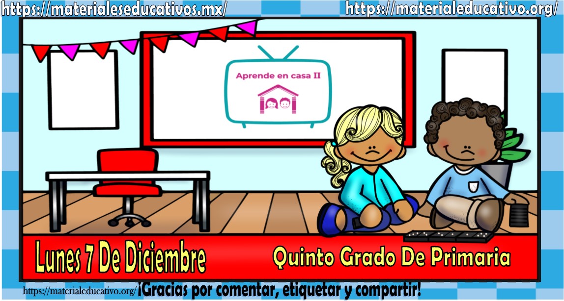 Amigos, compañeros docentes, padres de familia y alumnos que nos visitan, como ya es costumbre nosotros les proporcionaremos las clases contempladas para observarse en la TV del programa aprende en casa II, lo que antes se conocía como videos y preguntas. En esta oportunidad les queremos proporcionar las clases del quinto grado de primaria del lunes 7 de diciembre del 2020 del presente ciclo escolar 2020 – 2021, estaremos seguros que con este material podrá facilitar la realización de las actividades planteadas por parte del programa. Muchas gracias por visitarnos y recuerden que aquí podrán encontrar las preguntas, videos y todas las clases del programa de aprende en casa 2. Recuerden compartir nuestros enlaces en sus redes sociales y etiquetar a sus compañeros y amigos docentes en nuestras publicaciones.
