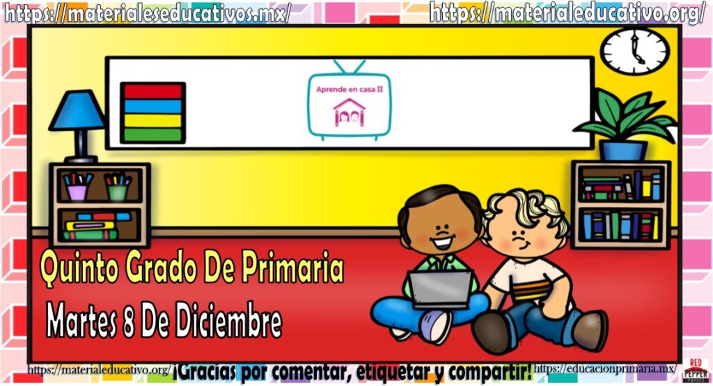 Amigos, compañeros docentes, padres de familia y alumnos que nos visitan, como ya es costumbre nosotros les proporcionaremos las clases contempladas para observarse en la TV del programa aprende en casa II, lo que antes se conocía como videos y preguntas. En esta oportunidad les queremos proporcionar las clases del quinto grado de primaria del martes 8 de diciembre del 2020 del presente ciclo escolar 2020 – 2021, estaremos seguros que con este material podrá facilitar la realización de las actividades planteadas por parte del programa. Muchas gracias por visitarnos y recuerden que aquí podrán encontrar las preguntas, videos y todas las clases del programa de aprende en casa 2. Recuerden compartir nuestros enlaces en sus redes sociales y etiquetar a sus compañeros y amigos docentes en nuestras publicaciones.