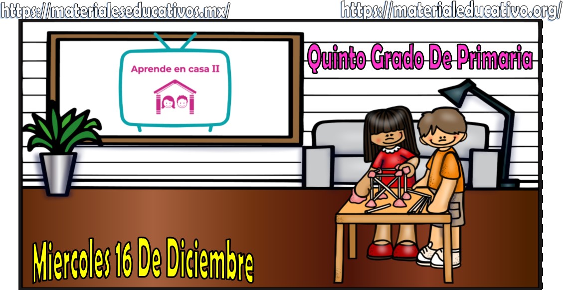Amigos, compañeros docentes, padres de familia y alumnos que nos visitan, como ya es costumbre nosotros les proporcionaremos las clases contempladas para observarse en la TV del programa aprende en casa II, lo que antes se conocía como videos y preguntas. En esta oportunidad les queremos proporcionar las clases del quinto grado de primaria del martes 15 de diciembre del 2020 del presente ciclo escolar 2020 – 2021, estaremos seguros que con este material podrá facilitar la realización de las actividades planteadas por parte del programa. Muchas gracias por visitarnos y recuerden que aquí podrán encontrar las preguntas, videos y todas las clases del programa de aprende en casa 2. Recuerden compartir nuestros enlaces en sus redes sociales y etiquetar a sus compañeros y amigos docentes en nuestras publicaciones.