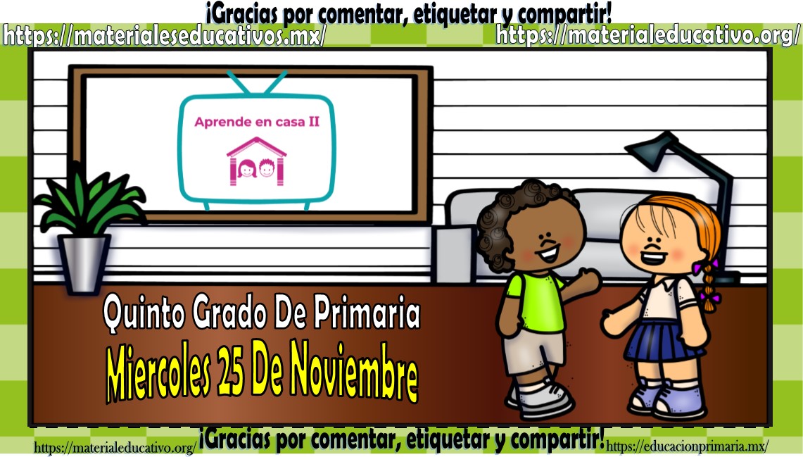 Amigos, compañeros docentes, padres de familia y alumnos que nos visitan, como ya es costumbre nosotros les proporcionaremos las clases contempladas para observarse en la TV del programa aprende en casa II, lo que antes se conocía como videos y preguntas. En esta oportunidad les queremos proporcionar las clases del quinto grado de primaria del miércoles 25 de noviembre del 2020 del presente ciclo escolar 2020 – 2021, estaremos seguros que con este material podrá facilitar la realización de las actividades planteadas por parte del programa. Muchas gracias por visitarnos y recuerden que aquí podrán encontrar las preguntas, videos y todas las clases del programa de aprende en casa 2. Recuerden compartir nuestros enlaces en sus redes sociales y etiquetar a sus compañeros y amigos docentes en nuestras publicaciones.