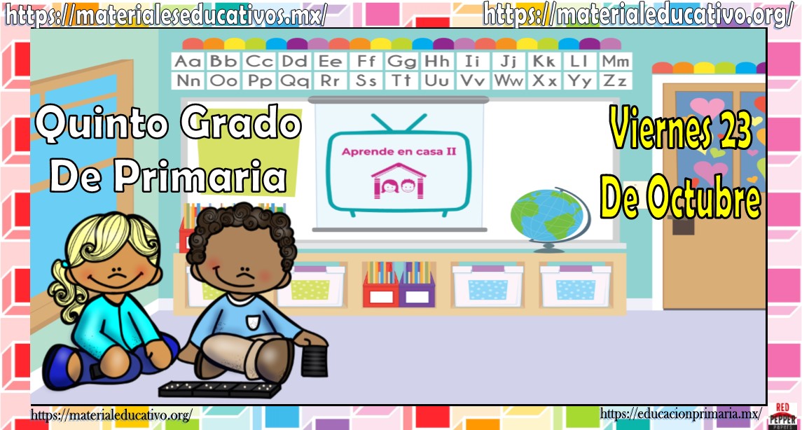 Amigos, compañeros docentes, padres de familia y alumnos que nos visitan, como ya es costumbre nosotros les proporcionaremos las clases contempladas para observarse en la TV del programa aprende en casa II, lo que antes se conocía como videos y preguntas. En esta oportunidad les queremos proporcionar las clases del quinto grado de primaria del viernes 23 de octubre del 2020 del presente ciclo escolar 2020 – 2021, estaremos seguros que con este material podrá facilitar la realización de las actividades planteadas por parte del programa. Muchas gracias por visitarnos y recuerden que aquí podrán encontrar las preguntas, videos y todas las clases del programa de aprende en casa 2. Recuerden compartir nuestros enlaces en sus redes sociales y etiquetar a sus compañeros y amigos docentes en nuestras publicaciones.