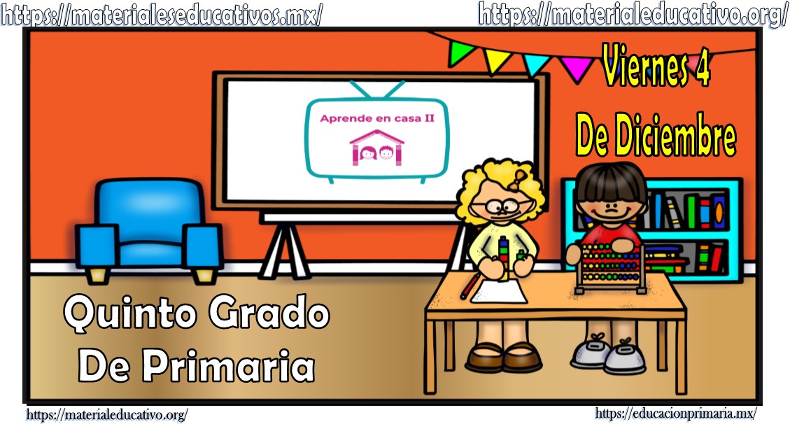 Amigos, compañeros docentes, padres de familia y alumnos que nos visitan, como ya es costumbre nosotros les proporcionaremos las clases contempladas para observarse en la TV del programa aprende en casa II, lo que antes se conocía como videos y preguntas. En esta oportunidad les queremos proporcionar las clases del quinto grado de primaria del viernes 4 de diciembre del 2020 del presente ciclo escolar 2020 – 2021, estaremos seguros que con este material podrá facilitar la realización de las actividades planteadas por parte del programa. Muchas gracias por visitarnos y recuerden que aquí podrán encontrar las preguntas, videos y todas las clases del programa de aprende en casa 2. Recuerden compartir nuestros enlaces en sus redes sociales y etiquetar a sus compañeros y amigos docentes en nuestras publicaciones.