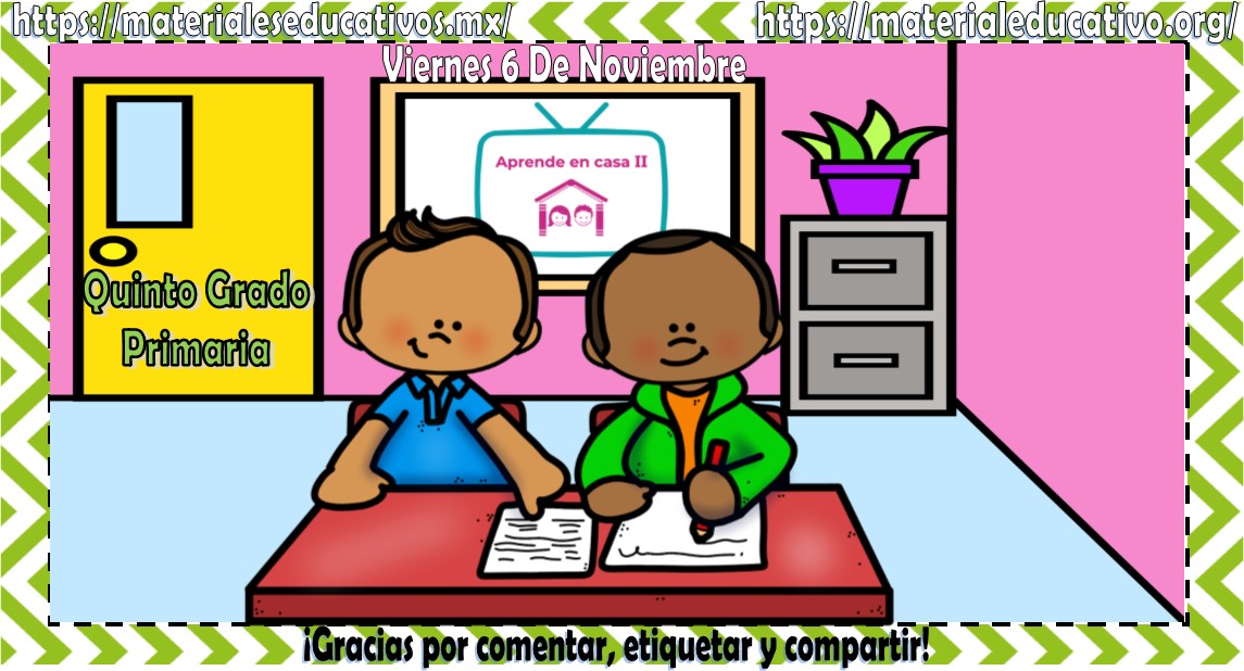 Amigos, compañeros docentes, padres de familia y alumnos que nos visitan, como ya es costumbre nosotros les proporcionaremos las clases contempladas para observarse en la TV del programa aprende en casa II, lo que antes se conocía como videos y preguntas. En esta oportunidad les queremos proporcionar las clases del quinto grado de primaria del viernes 6 de noviembre del 2020 del presente ciclo escolar 2020 – 2021, estaremos seguros que con este material podrá facilitar la realización de las actividades planteadas por parte del programa. Muchas gracias por visitarnos y recuerden que aquí podrán encontrar las preguntas, videos y todas las clases del programa de aprende en casa 2. Recuerden compartir nuestros enlaces en sus redes sociales y etiquetar a sus compañeros y amigos docentes en nuestras publicaciones.
