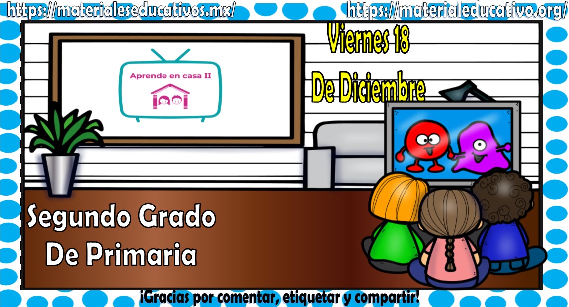Amigos, compañeros docentes, padres de familia y alumnos que nos visitan, como ya es costumbre nosotros les proporcionaremos las clases contempladas para observarse en la TV del programa aprende en casa II, lo que antes se conocía como videos y preguntas. En esta oportunidad les queremos proporcionar las clases del segundo grado de primaria del viernes 18 de diciembre del 2020 del presente ciclo escolar 2020 – 2021, estaremos seguros que con este material podrá facilitar la realización de las actividades planteadas por parte del programa. Muchas gracias por visitarnos y recuerden que aquí podrán encontrar las preguntas, videos y todas las clases del programa de aprende en casa 2. Recuerden compartir nuestros enlaces en sus redes sociales y etiquetar a sus compañeros y amigos docentes en nuestras publicaciones.