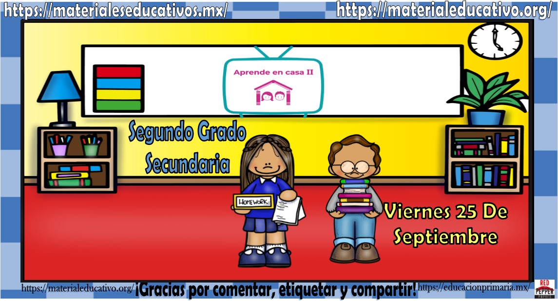 Amigos, compañeros docentes, padres de familia y alumnos que nos visitan, como ya es costumbre nosotros les proporcionaremos las clases contempladas para observarse en la TV del programa aprende en casa II, lo que antes se conocía como videos y preguntas. En esta oportunidad les queremos proporcionar las clases del segundo grado de secundaria del viernes 25 de septiembre del 2020 del presente ciclo escolar 2020 – 2021, estaremos seguros que con este material podrá facilitar la realización de las actividades planteadas por parte del programa. Muchas gracias por visitarnos y recuerden que aquí podrán encontrar las preguntas, videos y todas las clases del programa de aprende en casa 2. Recuerden compartir nuestros enlaces en sus redes sociales y etiquetar a sus compañeros y amigos docentes en nuestras publicaciones.