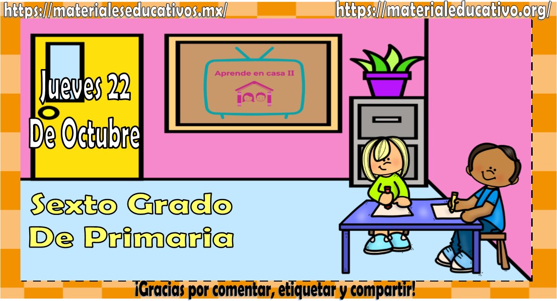 Amigos, compañeros docentes, padres de familia y alumnos que nos visitan, como ya es costumbre nosotros les proporcionaremos las clases contempladas para observarse en la TV del programa aprende en casa II, lo que antes se conocía como videos y preguntas. En esta oportunidad les queremos proporcionar las clases del sexto grado de primaria del jueves 22 de octubre del 2020 del presente ciclo escolar 2020 – 2021, estaremos seguros que con este material podrá facilitar la realización de las actividades planteadas por parte del programa. Muchas gracias por visitarnos y recuerden que aquí podrán encontrar las preguntas, videos y todas las clases del programa de aprende en casa 2. Recuerden compartir nuestros enlaces en sus redes sociales y etiquetar a sus compañeros y amigos docentes en nuestras publicaciones.