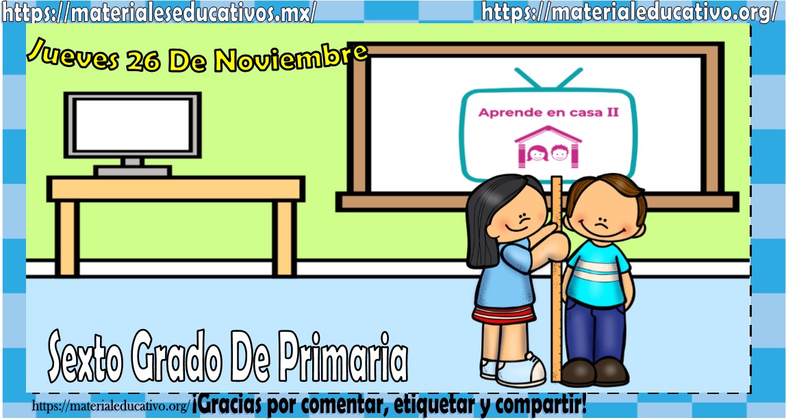 Amigos, compañeros docentes, padres de familia y alumnos que nos visitan, como ya es costumbre nosotros les proporcionaremos las clases contempladas para observarse en la TV del programa aprende en casa II, lo que antes se conocía como videos y preguntas. En esta oportunidad les queremos proporcionar las clases del sexto grado de primaria del jueves 26 de noviembre del 2020 del presente ciclo escolar 2020 – 2021, estaremos seguros que con este material podrá facilitar la realización de las actividades planteadas por parte del programa. Muchas gracias por visitarnos y recuerden que aquí podrán encontrar las preguntas, videos y todas las clases del programa de aprende en casa 2. Recuerden compartir nuestros enlaces en sus redes sociales y etiquetar a sus compañeros y amigos docentes en nuestras publicaciones.