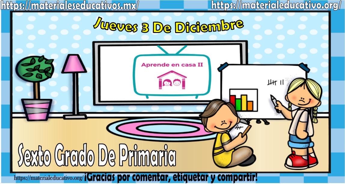 Amigos, compañeros docentes, padres de familia y alumnos que nos visitan, como ya es costumbre nosotros les proporcionaremos las clases contempladas para observarse en la TV del programa aprende en casa II, lo que antes se conocía como videos y preguntas. En esta oportunidad les queremos proporcionar las clases del sexto grado de primaria del jueves 3 de diciembre del 2020 del presente ciclo escolar 2020 – 2021, estaremos seguros que con este material podrá facilitar la realización de las actividades planteadas por parte del programa. Muchas gracias por visitarnos y recuerden que aquí podrán encontrar las preguntas, videos y todas las clases del programa de aprende en casa 2. Recuerden compartir nuestros enlaces en sus redes sociales y etiquetar a sus compañeros y amigos docentes en nuestras publicaciones.